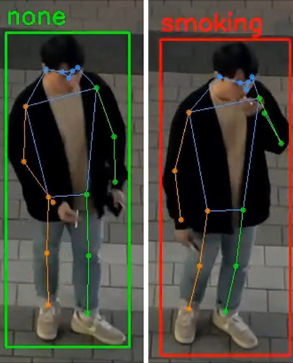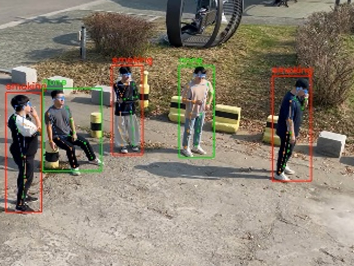 행동 분석 모델(AI Pose Model)을 활용하여 다양한 흡연자 포즈(Smoker Pose)를 직접 반복 학습한 독자적 AI 알고리즘 적용